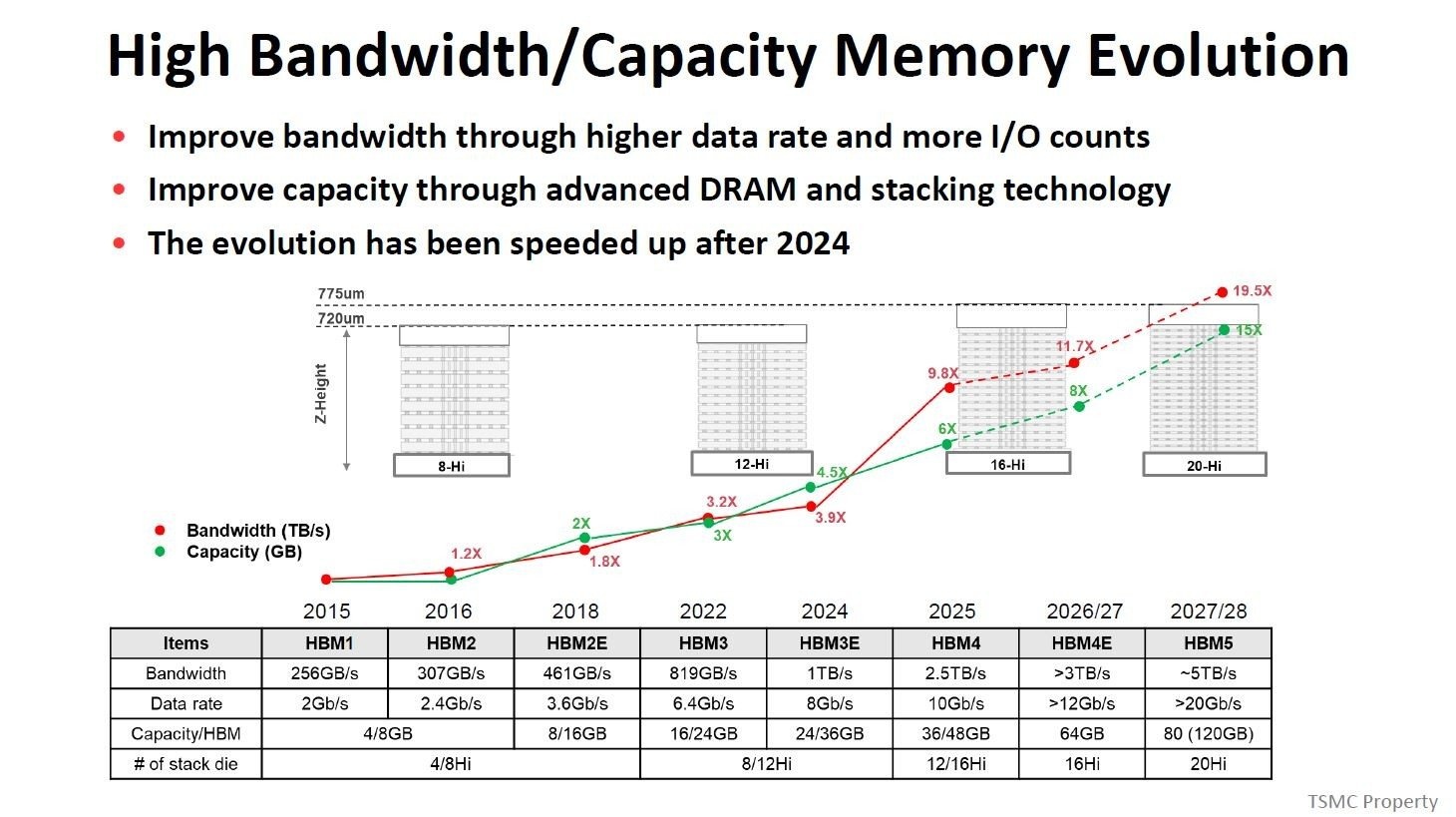 除了存储容量的拓展,HBM的传输性能也在持续突破,单个输入/输出电极的数据传输速率实现了大幅飞跃,从第一代HBM1的2Gbit/s,一路提升至最新HBM4的10Gbit/s,速率直接提高五倍;同时HBM4的总线宽度也完成翻倍,达到2048位,对应2048个输入/输出电极,再结合电极间距缩小、电源电压降低等配套优化,HBM4的整体带宽相较上一代HBM3E直接提升2.5倍,完美适配了高端AI与HPC系统日益增长的算力传输需求。