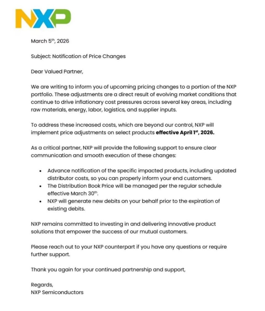 全球模拟芯片大厂恩智浦近日也发布了涨价函,官宣自2026年4月1日起对部分产品调价。此次调价系受原材料、能源等多环节成本上涨影响,同时将提供多项支持保障调价顺畅执行。