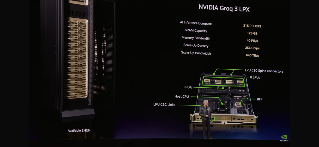 英伟达构建了包含256个Groq 3 LPU的Groq 3 LPX机架。该机架提供128GB的SRAM和40 PB/s的推理加速带宽,并通过每个机架640 TB/s的专用扩展接口将这些芯片连接起来。