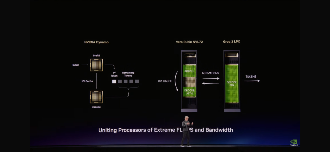 两种处理器的统一:LPU + Vera Rubin。“我们想出了一个绝妙的主意,”黄仁勋解释道,“我们将推理过程完全重新架构。我们把适合Vera Rubin的工作放在Vera Rubin上,然后把解码生成、低延迟、带宽受限的部分卸载到LPU上。”