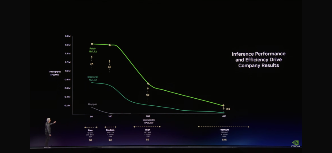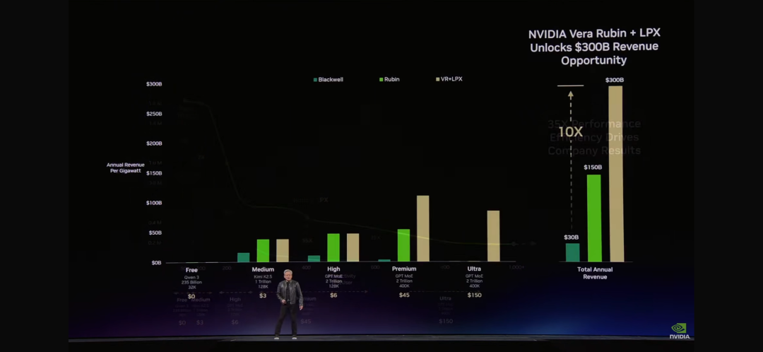 “就像任何行业一样,"黄仁勋解释道,"更高的质量,更高的性能,更低的容量。Grace Blackwell在你的免费层提升了巨大吞吐量,但在你最能变现的层级,它提升了35倍。Vera Rubin又在这个基础上提升了10倍。