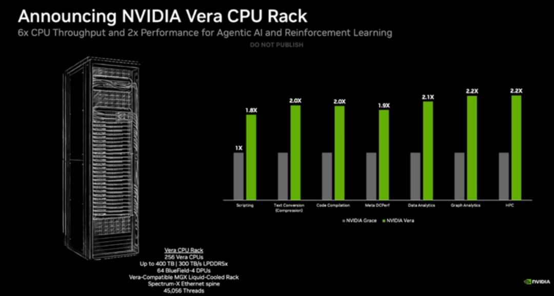 Vera CPU的定位是大规模数据处理、AI 训练和智能体推理场景,其效率是传统机架式CPU 的两倍,速度提升50%。