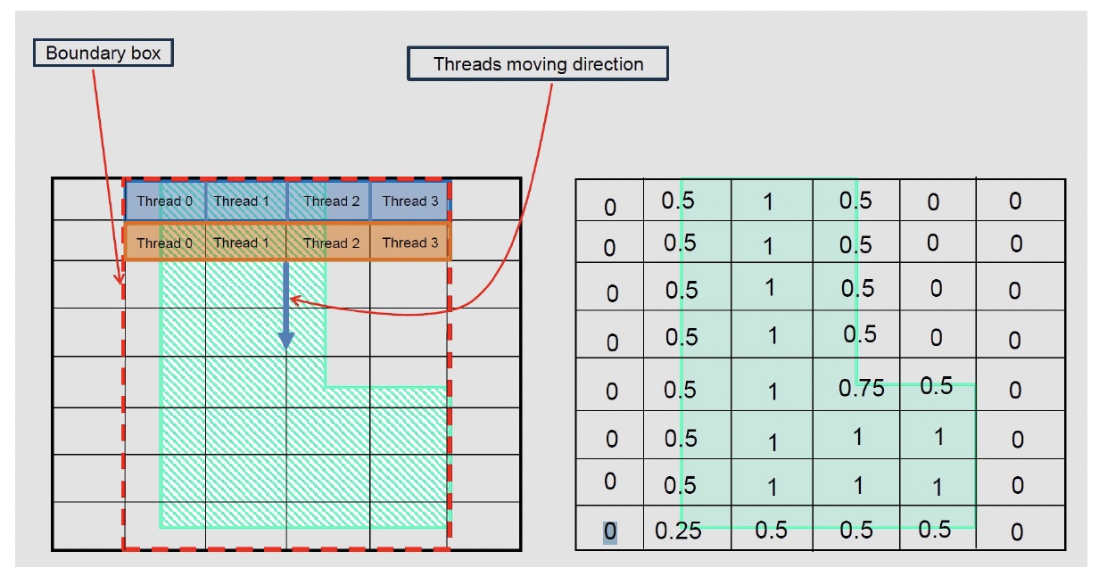 光栅化流水线从 CPU 侧预处理开始:版图数据被解析并分箱到空间瓦片(tile)中。这些瓦片以优化为连续访问的内存格式传输至 GPU。在 GPU 上,每个瓦片独立处理:几何数据缓存到共享内存中,线程被分配到像素或像素小组,每个线程判断其对应像素位于多边形内部、外部还是边界上。