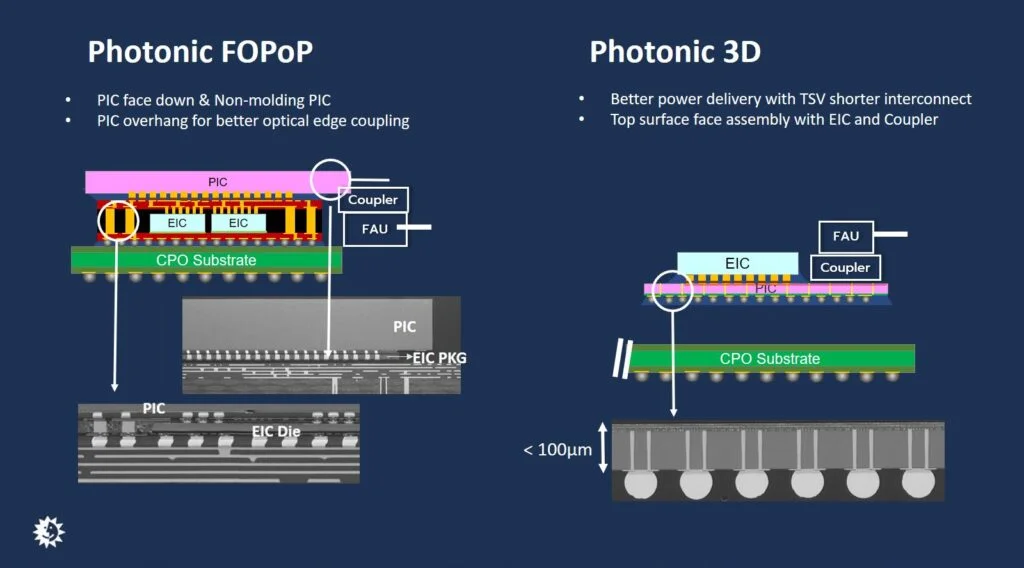 CPO 组装涉及激光器、光学组件、FAU、不同工艺节点的硅基 IC 等多类器件,流程极其精密,尤其是 EIC 与 PIC 的集成。实现更高带宽密度主要有两条技术路线:Photonic FOPoP将 PIC 置于 EIC 上方,采用晶圆级扇出工艺与铜柱实现垂直互联。Photonic 3D将 PIC 置于下方,通过硅通孔(TSV)连接顶部的 EIC。该方案散热更优,支持单通道速率超过 200G,是高性能场景的首选方案。