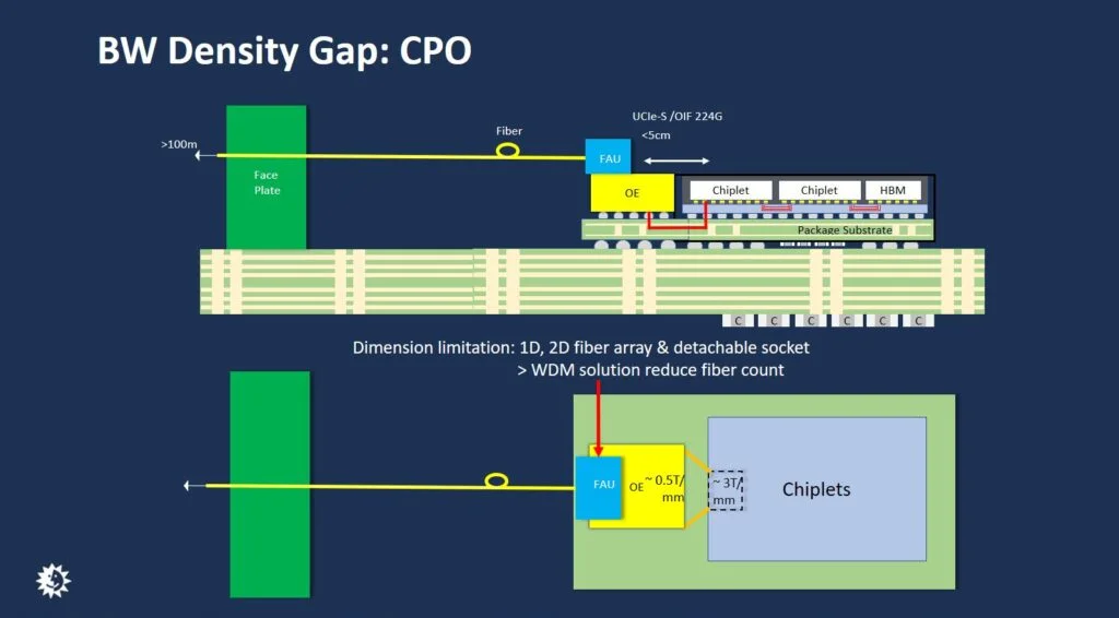 AI小芯片(chiplet)与当前光互联之间存在显著带宽密度差距:采用 UCIe 或 OIF 标准的 AI 小芯片带宽密度约为 3 Tbps/mm,而当前最先进的 CPO 方案仅约 0.5 Tbps/mm,差距达6 倍。