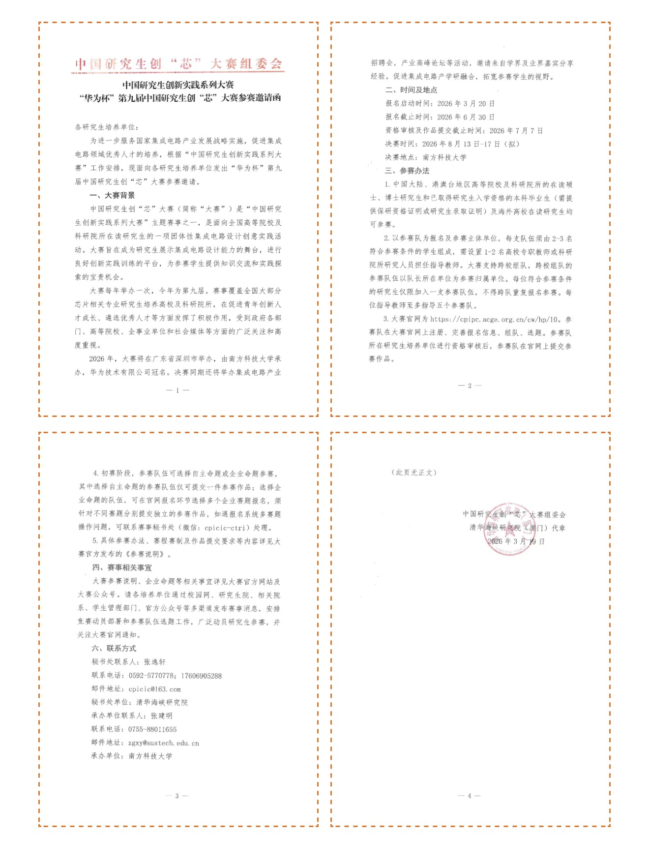 为进一步服务国家集成电路产业发展战略实施,促进集成电路领域优秀人才的培养,根据“中国研究生创新实践系列大赛”工作安排,现面向各研究生培养单位发出“华为杯”第九届中国研究生创“芯”大赛参赛邀请。