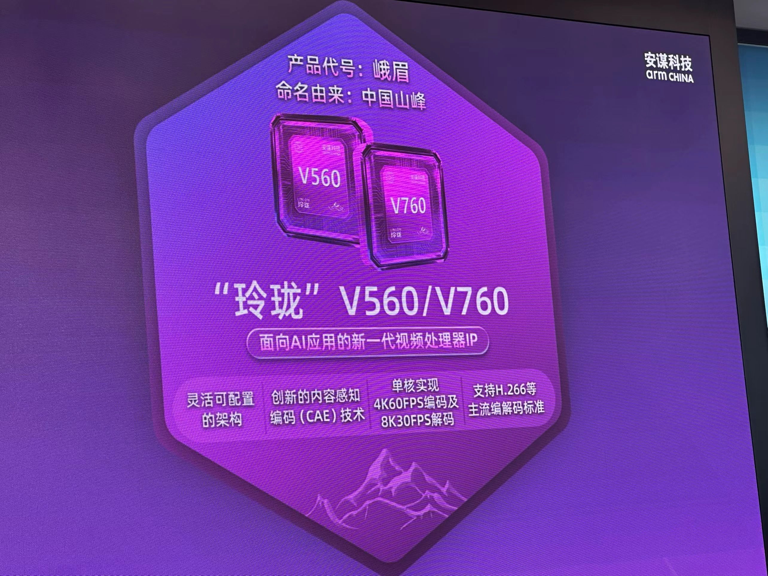 安谋科技发布面向AI应用的新一代视频处理器IP,V560/V760 VPU IP,代号峨眉。据介绍,该产品单核实现4K60FPS编码及8K30FPS解码,支持H.266等主流编解码标准,具备可配置的架构及内容感知编码(CAE)技术。安谋科技VPU产品总监表示,该产品发布是安谋科技All in Al战略的重要一步,其可应用于云边端等AI场景。目前,该产品已向下游部分客户授权。