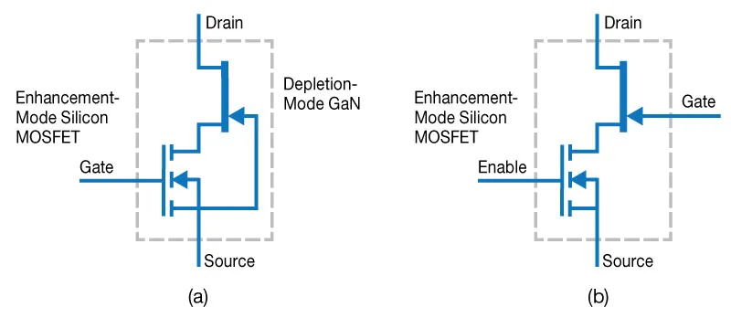 单片增强型 GaN 晶体管的一种替代方案是混合级联结构:将低压增强型硅 MOSFET 与高压耗尽型 GaN HEMT 串联。