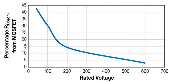 随之而来的问题是:硅 MOSFET 会给 GaN 器件带来多少额外的导通电阻 RDS(on)。级联系统中,MOSFET 对总 RDS(on) 的贡献比例与系统额定电压的关系曲线。在高压区间,GaN 器件占主导,MOSFET 的贡献很小。