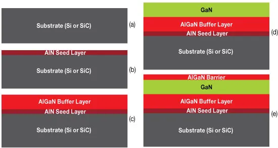GaN HEMT 的制造始于在异质衬底上外延生长 GaN/AlGaN 异质结。与有源层与衬底一致的硅器件不同,GaN HEMT 需要异质外延:在晶格常数与热膨胀系数不匹配的衬底上生长纤锌矿晶体。