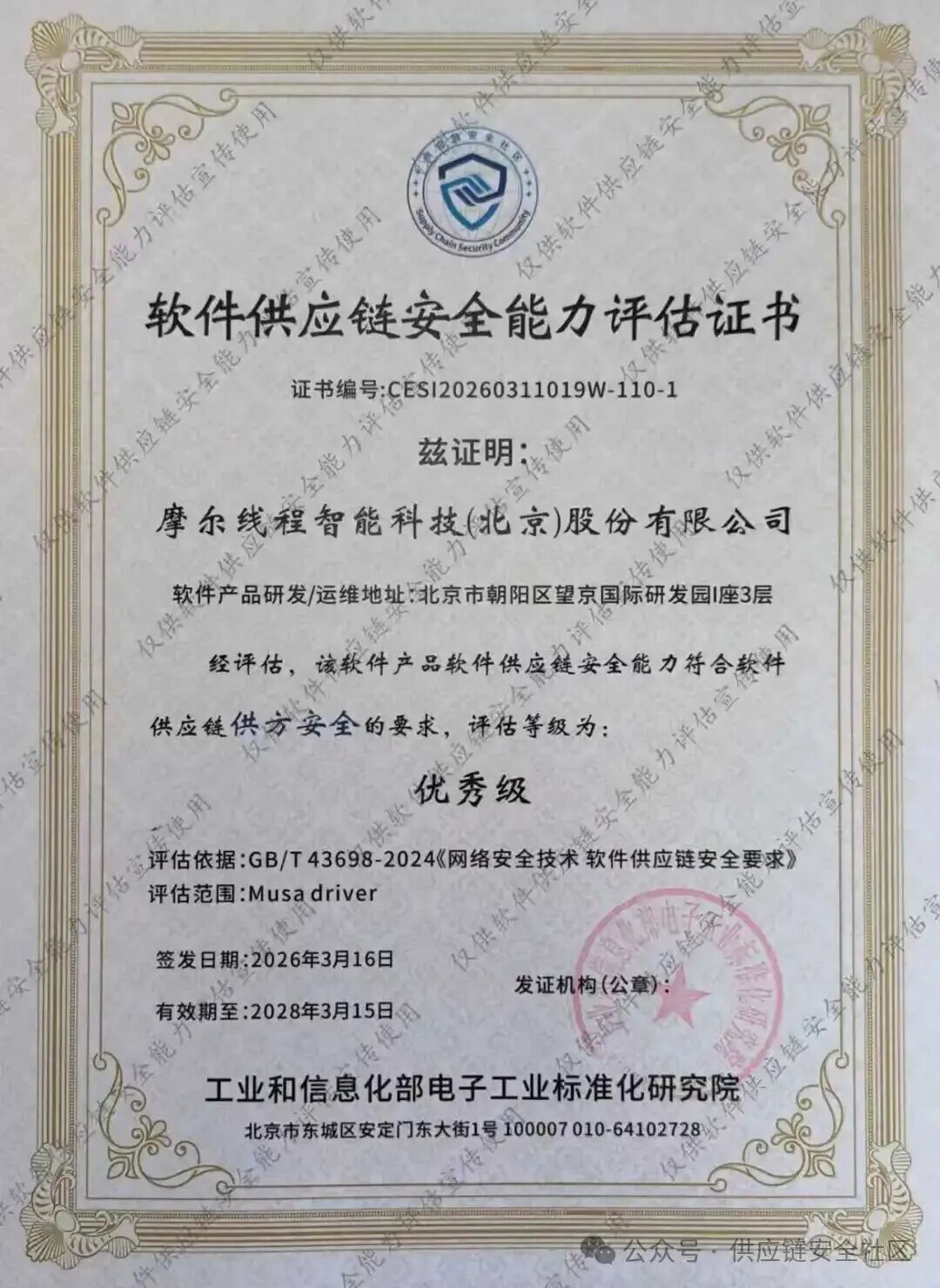 近期,工业和信息化部电子工业标准化研究院组建软件供应链安全评估组,依据国家标准《网络安全技术 软件供应链安全要求》(GB/T 43698-2024),紧扣供方安全要求,针对摩尔线程智能科技(北京)股份有限公司推出的旗舰级AI训推一体智算卡MTT S5000的MUSA驱动程序,从风险管理、组织管理及供应活动管理三大维度,覆盖75项评估指标,开展了全面的安全能力评估工作。