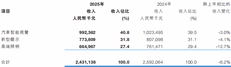 晶科电子发布2025年年度报告。报告显示,公司全年实现营业收入24.31亿元,同比下降6%;净利润为人民币0.62亿元,同比下降41%;三大核心业务汽车智能视觉产品、新型显示产品、高端照明产品的占比分别为41%、32%、27%。营业收入及净利润有所下降,主要原因是汽车行业竞争剧烈导致整灯销售单价下降,以及本集团投资建设广州领为视觉大湾区总部及研发基地的相关费用上升。