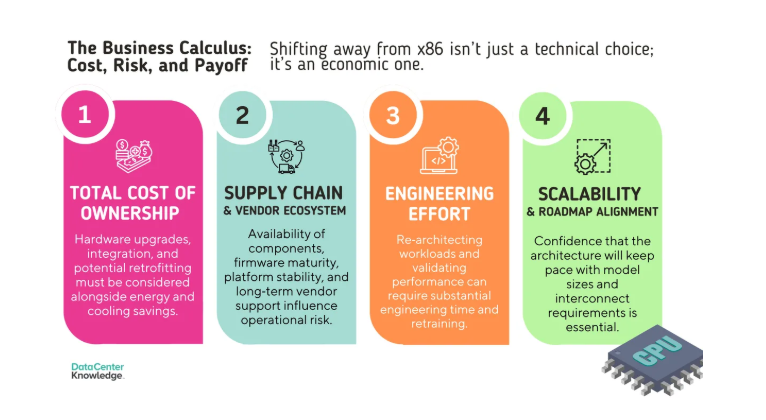 替代 CPU 架构能够在不牺牲性能的前提下,提升 AI 数据中心的能效与散热表现,但提升幅度的大小,完全取决于 CPU 的实际工作负载。对于企业而言,核心决策难题在于:通过节能降耗与散热优化所节省的成本,再加上潜在的性能收益,是否足以覆盖硬件采购、软件升级与组织架构调整所产生的支出。