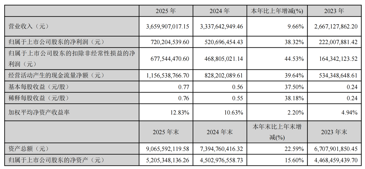 鼎龙股份发布2025年年度报告,全年实现营业收入36.6亿元,同比增长9.66%;归属于上市公司股东的净利润7.2亿元,同比增长38.32%;扣非后归母净利润6.78亿元,同比增长44.53%,基本每股收益0.77元,经营活动产生的现金流量净额11.56亿元,同比增长39.64%。