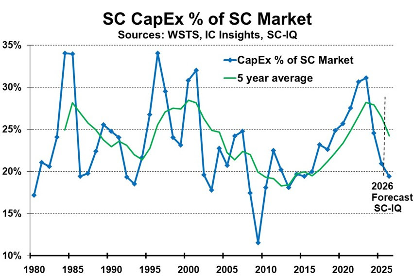预计2026年该比值将降至 19%,五年均值降至 24%。因此,即便2026年资本开支预计增长 20%,整体规模并未超出半导体市场增速。若未来数年半导体市场保持稳健增长,行业将不会出现产能过剩。