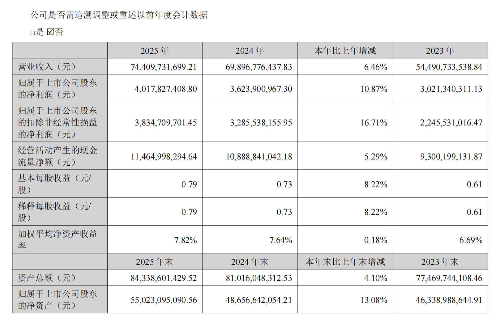 蓝思科技发布2025年年度报告,公司全年实现营业收入744.1亿元,同比增长6.46%;归属于上市公司股东的净利润40.18亿元,同比增长10.87%,扣非后净利润38.35亿元,同比增长16.71%,基本每股收益0.79元。