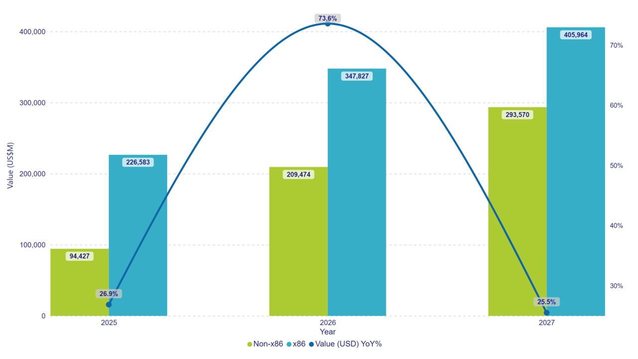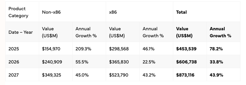 2025年第四季度,服务器市场支出增长了52.4%。销量同比增长10.3%,表现强劲。随着2024年产品更新换代浪潮的结束,非加速型服务器的增长速度有所放缓。人工智能基础设施建设仍然是主导力量,掩盖了经济放缓、供应链中断、关税和地缘政治冲突等宏观挑战。目前尚未出现消化期;一家主要买家消化订单的同时,其他买家也在加速采购。