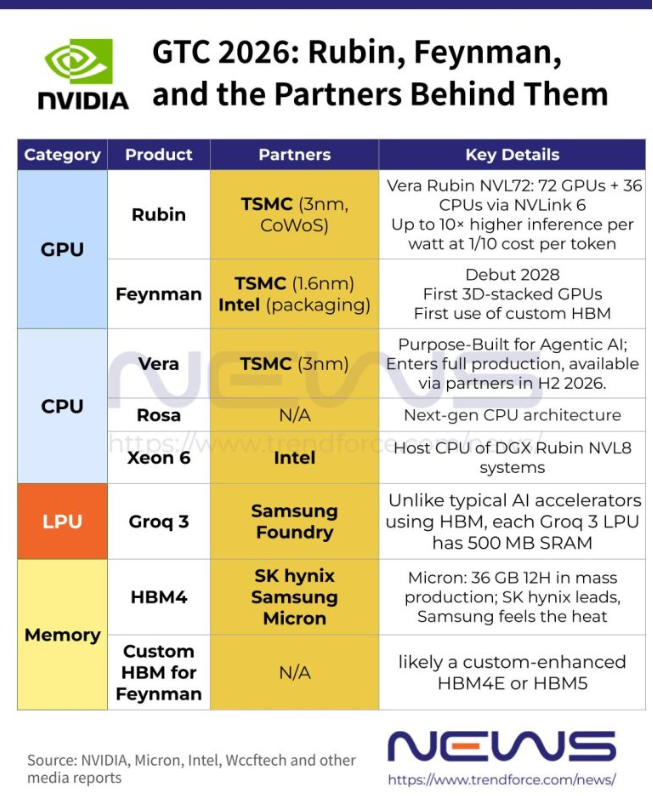 在更长远的布局上,据Wccftech报道,英伟达有意与英特尔在晶圆代工领域展开合作,借助英特尔包括EMIB在内的先进封装技术,为2028年亮相的Feynman GPU提供封装支持。值得注意的是,Feynman GPU的芯片本体预计采用台积电1.6nm工艺生产,英特尔的参与主要集中在封装环节。
