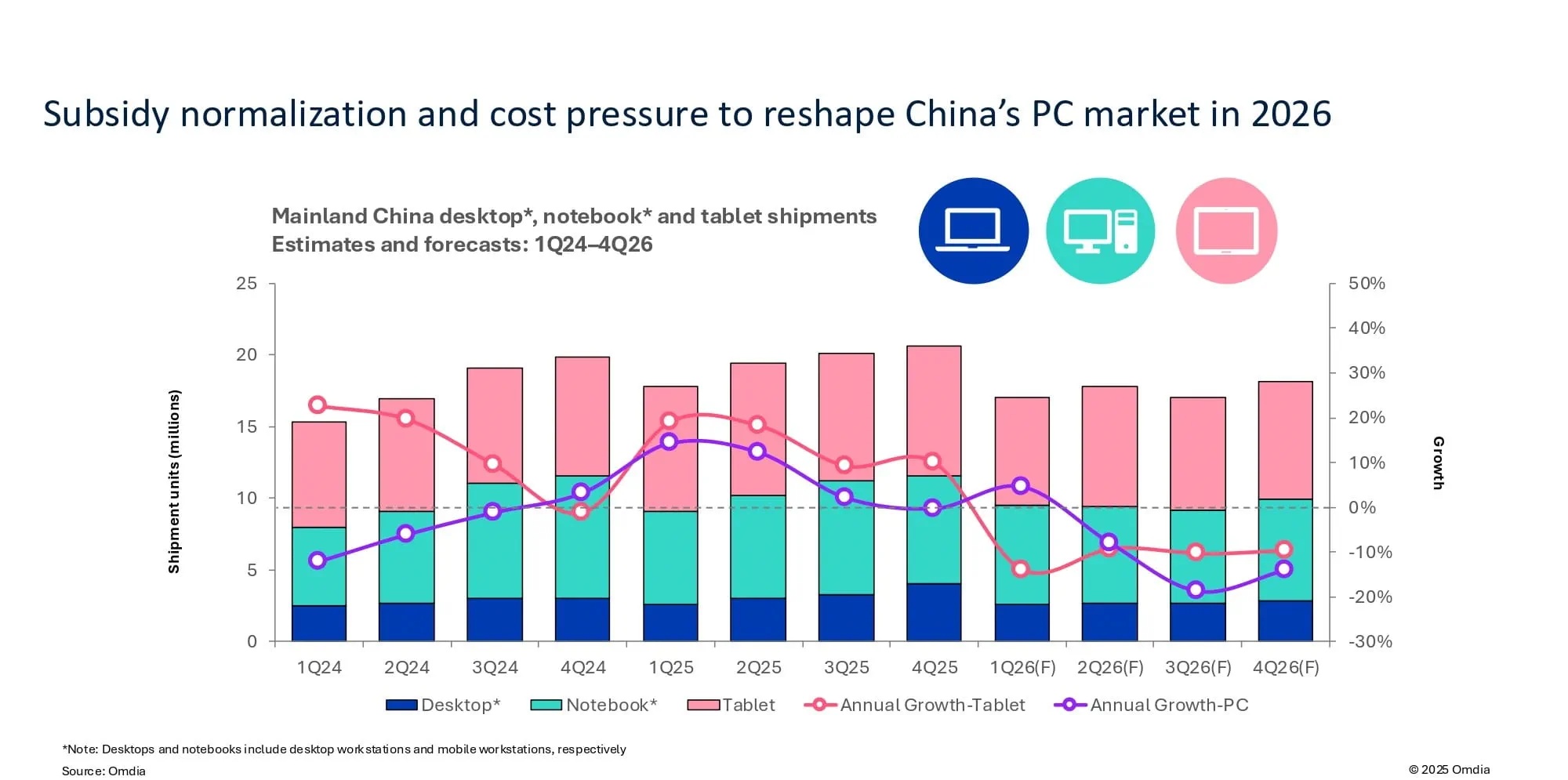 根据市场研究机构 Omdia 最新调研数据,2025年中国PC市场同比增长 6%,出货量达到 4210 万台;但受补贴政策调整及零部件成本上涨影响,预计2026年出货量将下滑 10%。