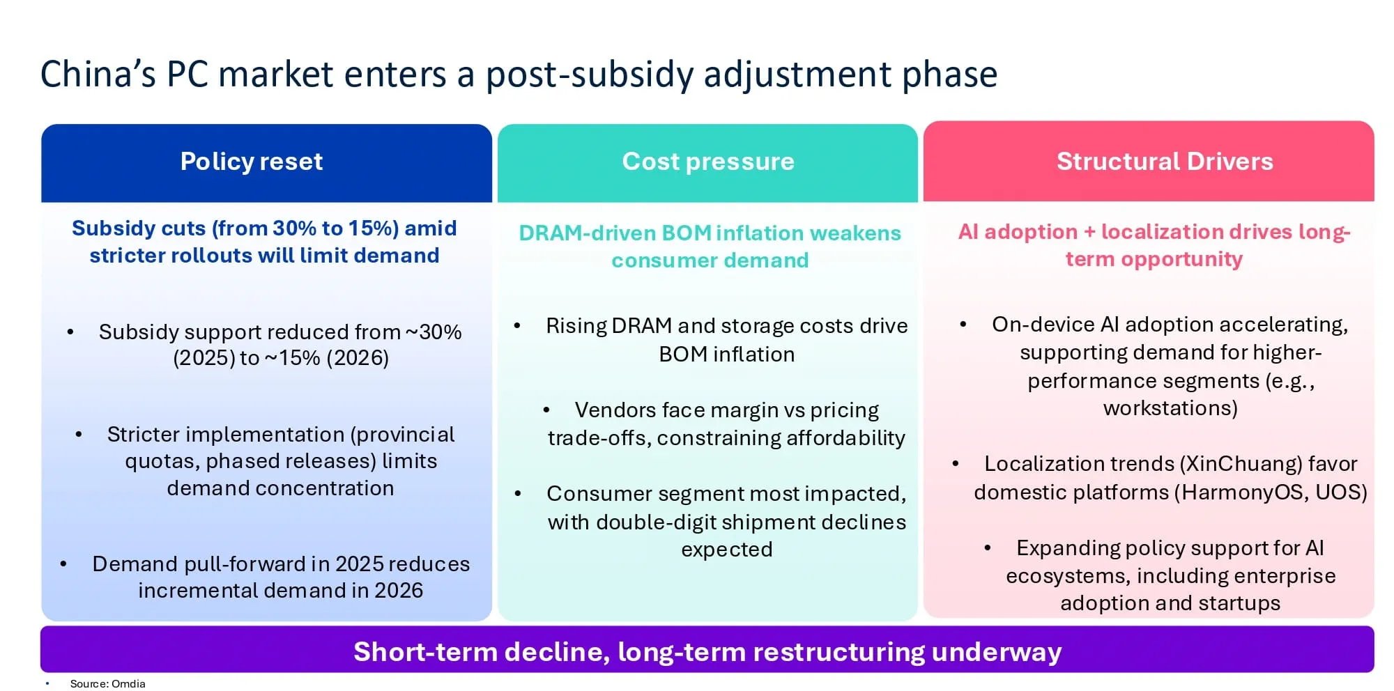Omdia 高级分析师 Emma Xu 表示:“2025年支撑PC需求的补贴政策在2026年迎来调整,整体补贴力度从去年的30%收窄至15%左右。更严格的执行规则,如省级配额、补贴分批发放等,将抑制需求在单一季度集中释放。同时,2025年的大规模补贴已明显提前透支需求,叠加零部件成本上涨、整机物料成本上升(尤其是存储芯片),2026年市场持续增长难度加大。多重因素叠加,不仅对品牌厂商,对整个中国PC生态而言,2026年都将是尤为艰难的一年。”