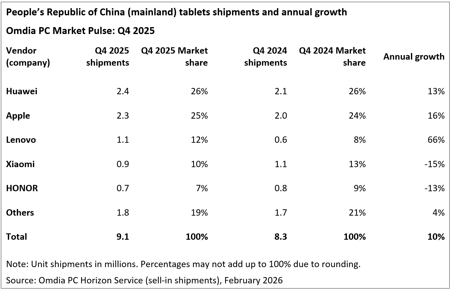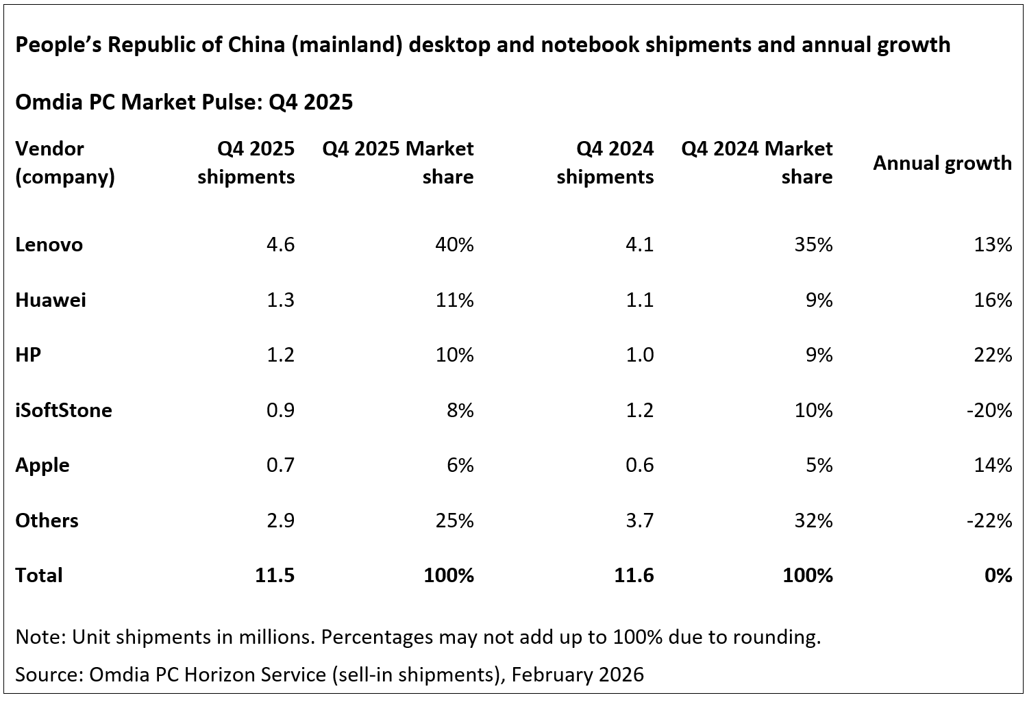 不过最新数据显示,2025年第四季度市场趋于平稳,出货量为 1150 万台,同比持平。受企业与政府采购需求强劲拉动,台式机(含台式工作站)出货量达 400 万台,同比增长 35%;与之相对,尽管政府补贴持续,消费需求疲软仍导致笔记本电脑(含移动工作站)出货量同比下滑 13%,至 750 万台;平板市场则保持强劲势头,出货量同比增长 10%,达 910 万台。