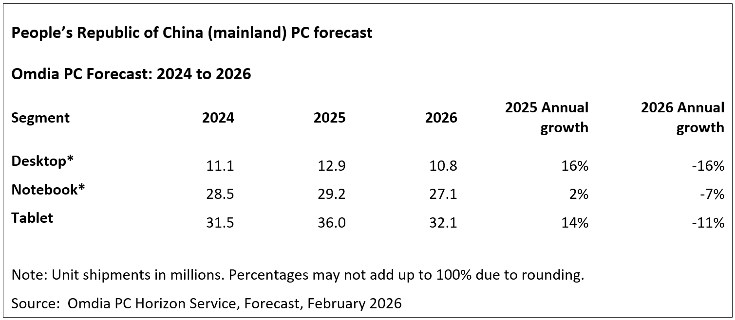 展望未来,中国PC和平板市场将面临显著压力。Omdia 预测,2026年中国PC出货量将降至 3790 万台;消费端下滑幅度更为明显,预计同比收缩 12%。平板市场在2025年高基数之后,2026年出货量也预计下降 11%,至 3200 万台。