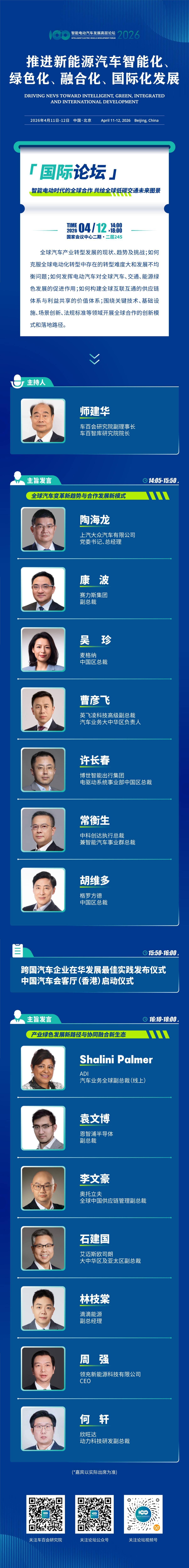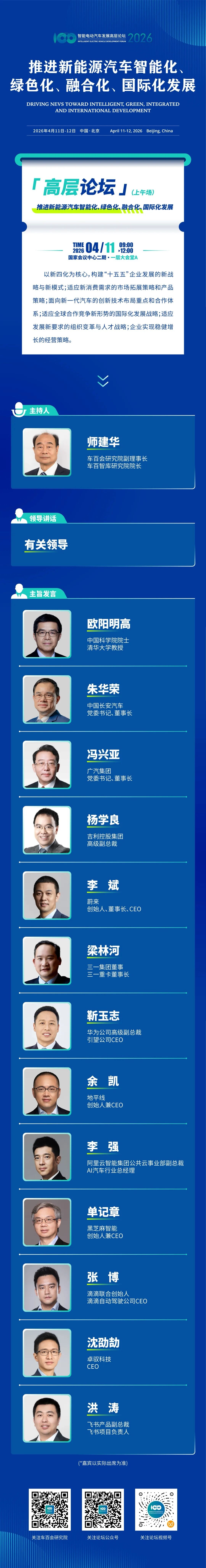 4月11日-12日,智能电动汽车发展高层论坛(2026)将在北京国家会议中心二期召开。论坛以“推进新能源汽车智能化、绿色化、融合化、国际化发展”为主题,届时举办1场高层论坛,1场国际论坛和8场主题论坛,包括Al+汽车论坛、市场与消费论坛、新能源汽车智能动力系统创新论坛、第六届车路城融合发展论坛、汽车设计论坛、智能汽车论坛、商用车可持续发展论坛、汽车“三新”前沿科技论坛。