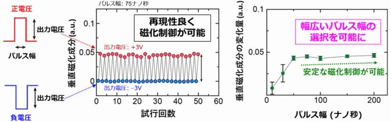 利用电压诱导静态磁化反转法控制磁化强度时,写入电压的脉冲宽度依赖性。来源:AIST