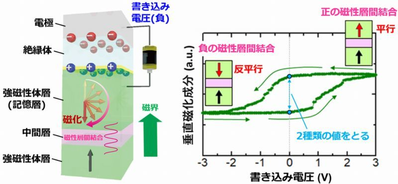 以往,厚度约为1 nm的单层铁磁材料一直被用作铁磁层(存储层)。然而,这次采用了“人工反铁磁材料”。当耦合能为负值时,两个磁化方向反平行,形成人工反铁磁材料。研究发现,通过绝缘层向这种人工反铁磁材料施加电压,可以改变层间磁耦合强度,从而在固定磁场下控制磁化构型。
