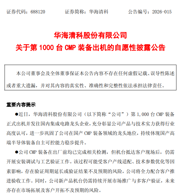 近日,华海清科股份有限公司第1000台化学机械抛光(CMP)装备出机,发往国内集成电路制造龙头企业。从“零的突破”到累计出机突破千台,华海清科用扎实的技术积累与持续的市场开拓,书写了国产高端半导体装备从追赶到并跑的跨越式发展。这既是华海清科奋斗征程的里程碑,更是其迈向更高目标的新起点。
