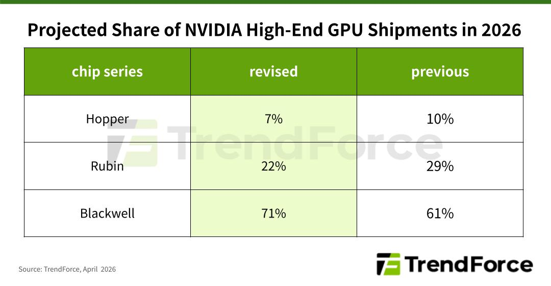 根据TrendForce最新发布的AI服务器研究报告,英伟达高端AI芯片出货结构预计将在2026年发生变化。受地缘政治问题与持续的供应链调整影响,Hopper与Rubin系列在高端GPU整体出货量中的合计占比预计将有所下滑。与此同时,Blackwell系列占比预计将从61%显著提升至71%,进一步巩固其市场主导地位。