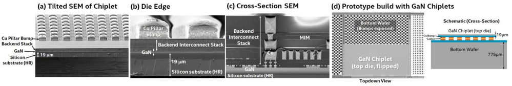图 1 为氮化镓小芯片的电子显微镜图像,可见完整堆叠结构下方 19μm 的超薄硅基底;图 1 (d) 为原型样品,氮化镓小芯片翻转键合至基底晶圆,展示了该技术在实际小芯片组装中的应用方式。