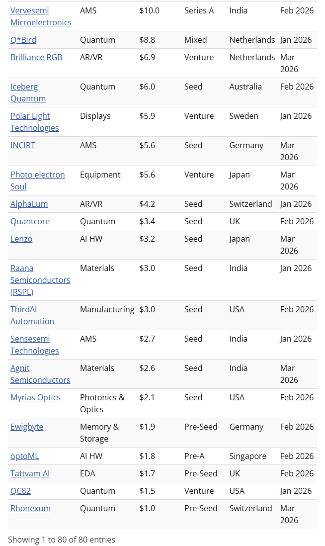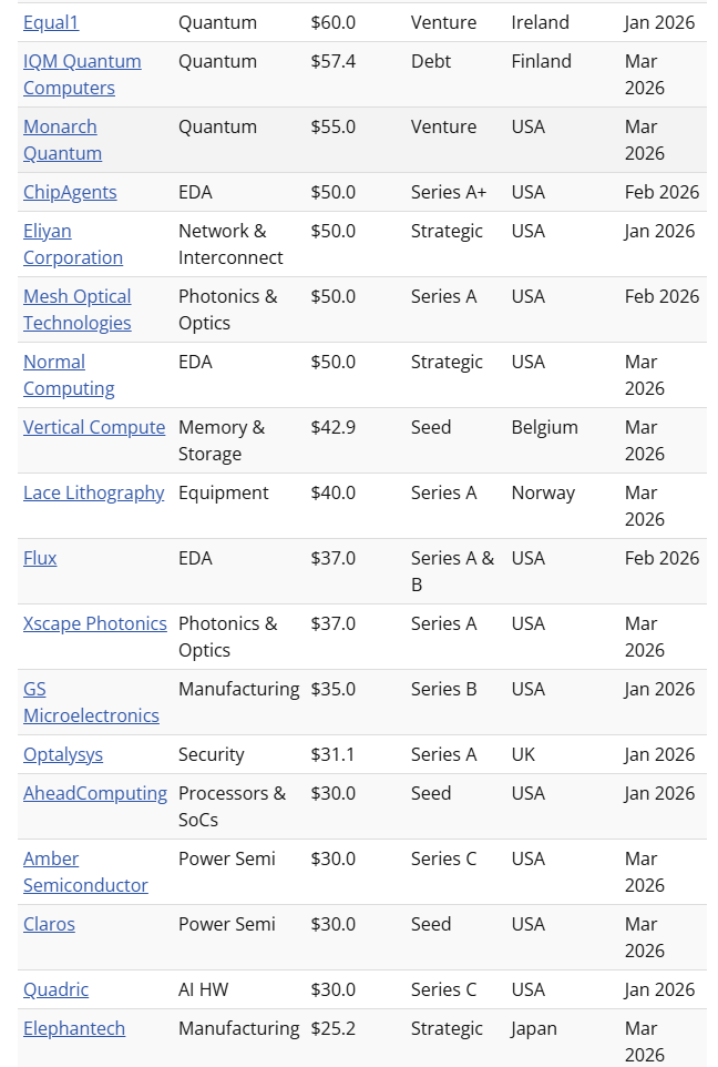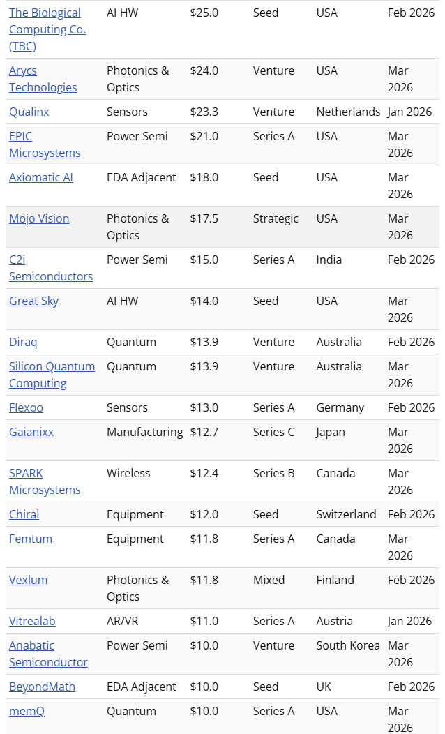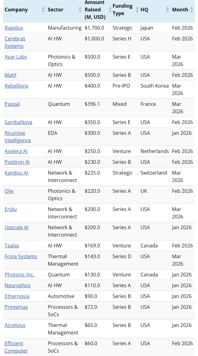 今年Q1,私营半导体公司便迎来强劲的融资浪潮,共有18家公司获得了超过1亿美元的巨额融资,其中Rapidus和Cerebras两家更是突破了10亿美元大关。不出所料,这些公司中的绝大多数要么致力于设计主要用于人工智能推理工作负载的芯片,要么试图通过改进从芯片级到数据中心级的互连技术来克服带宽限制。因此,光子学仍然是投资的热门领域。