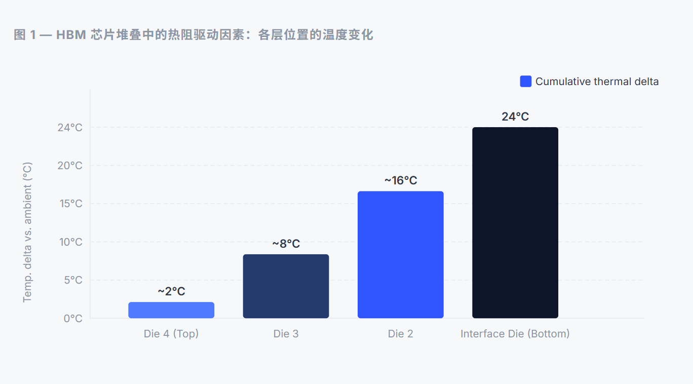 HBM 中的垂直芯片堆叠会产生与平面 2D 存储器截然不同的热阻问题:每一层 DRAM 都对下方的层起到部分绝缘作用,同时在读写操作过程中也会产生热量。其结果是形成渐进式的温度梯度,在堆叠底部最为严重——而底部也是整个器件中功率密度最高的位置。