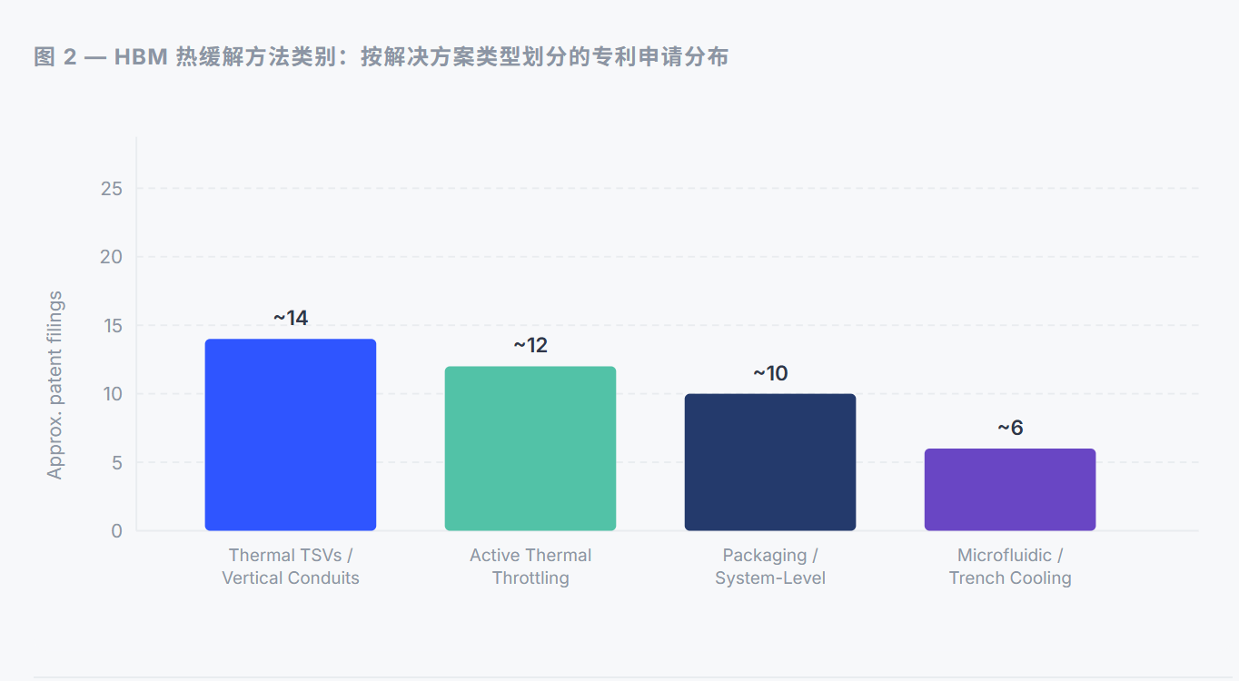 在所审查的40多项专利申请中,四大主要解决方案类别的大致分布情况如下:热式TSV和垂直导管结构占比最大,其次是主动节流方法。微流控沟槽冷却是占比最小但增长最快的类别。数值为基于所分析数据集的近似值。
