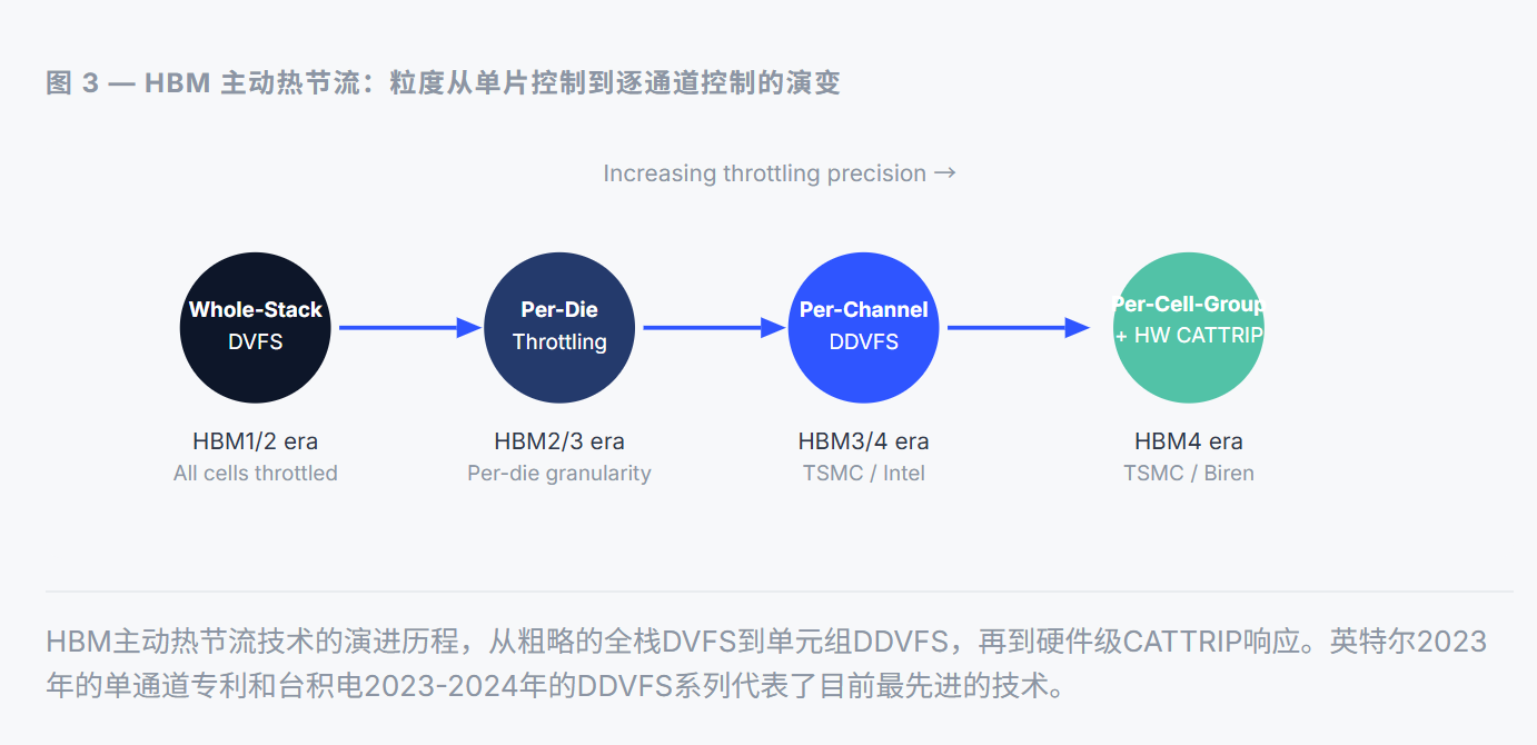 英特尔还公开了封装级主动散热管理技术(2021 年),该技术采用智能交叉开关,可根据芯片温度信息路由内存访问命令。通过将流量从过热的芯片转移开,这种方法可以防止热能积累,否则就需要进行硬性降频——这种软硬件协同设计方法已被JEDEC等组织认定为对 AI 加速器内存子系统日益重要。
