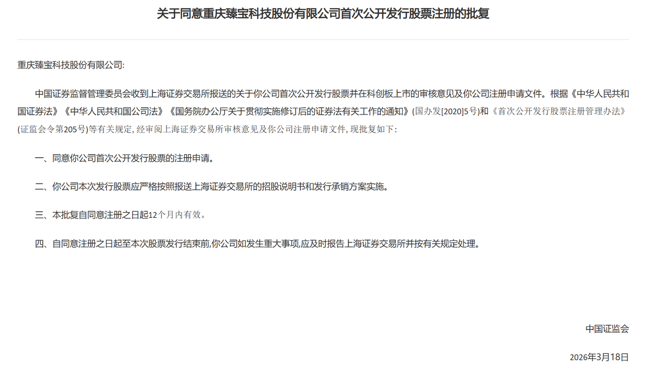 证监会日前下发关于同意重庆臻宝科技股份有限公司首次公开发行股票注册的批复,同意该公司首次公开发行股票并在科创板上市的注册申请。