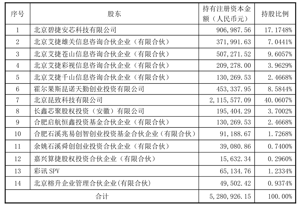 本次增资具体出资如下:长鑫芯聚出资15000万元,启航恒鑫出资10000万元,合肥石溪出资7000万元,余姚石溪出资3000万元,嘉兴算捷出资1200万元,彩讯股份出资5000万元,高榕出资3800 万元,上述投资方合计出资45000万元,获得增资后11.1006%的股权;此外,艾捷科芯核心管理层持股主体艾捷千山出资10000万元,获得增资后2.4668%的股权。