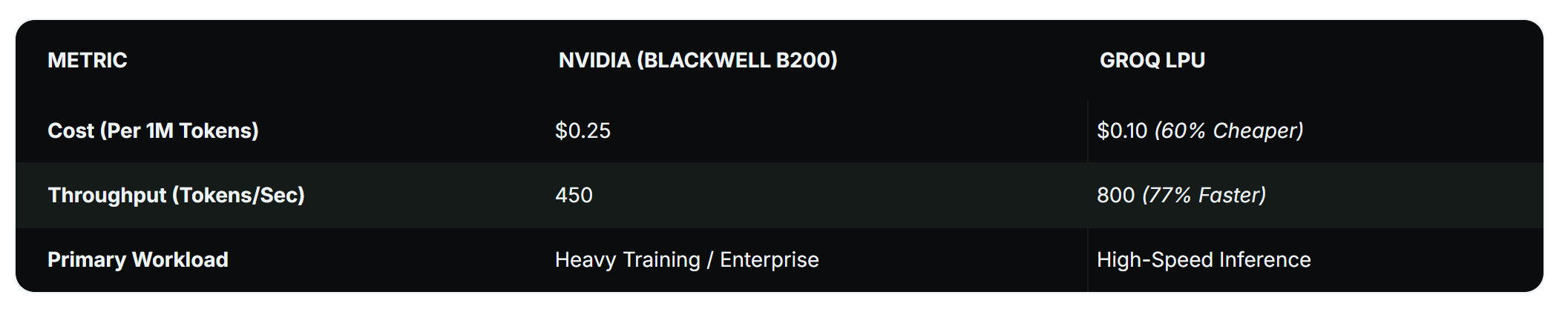 全新的计价体系下,企业开始采用按令牌、按百万令牌的计费方式。数据显示,Groq芯片成本优势显著,每百万令牌计费仅0.05至0.10美元;反观英伟达 GPU,定价高出五倍,B100、B200、B300 系列每百万令牌成本为0.25美元。除此之外,Groq 芯片兼顾低成本与高性能。据Nebius专家介绍,其芯片每秒最高可输出800令牌,处理速度接近英伟达芯片(每秒 450 令牌)的两倍。
