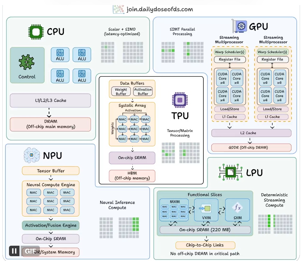 总体而言,人工智能计算从CPU的通用灵活,演进到LPU的高度专用,每一步都以牺牲部分通用性换取效率、功耗或延迟的优化。五种架构各有侧重、相互补充,构成人工智能硬件完整生态,支撑不同场景落地。下图并排展示了这五种技术的内部架构,可直观看出其结构差异。