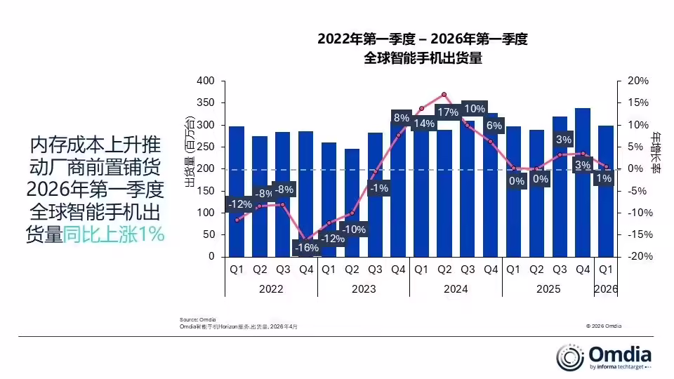 Omdia数据显示,2026 年第一季度,全球智能手机出货量达 2.985 亿台,同比增长 1%。