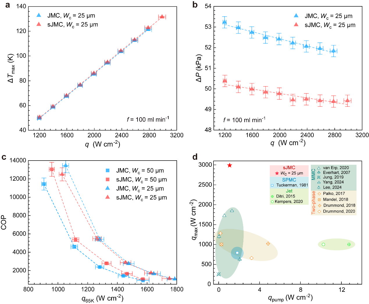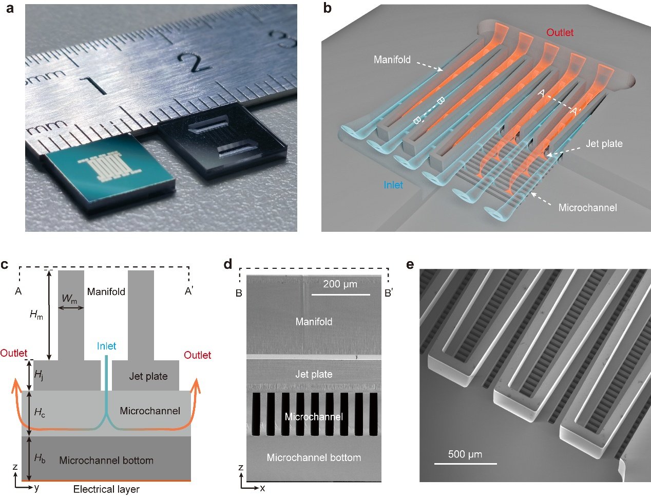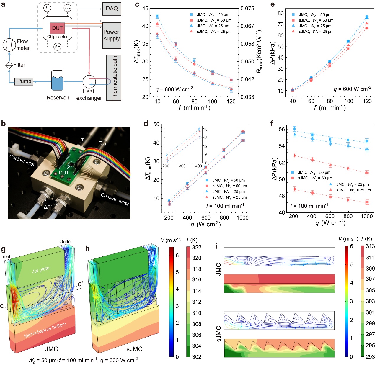 团队共测试了四种芯片变体,包括直通道(JMC, jet-enhanced manifold microchannel)和锯齿通道(sJMC, JMC with sawtooth wall),以及25微米和50微米两种典型通道宽度。