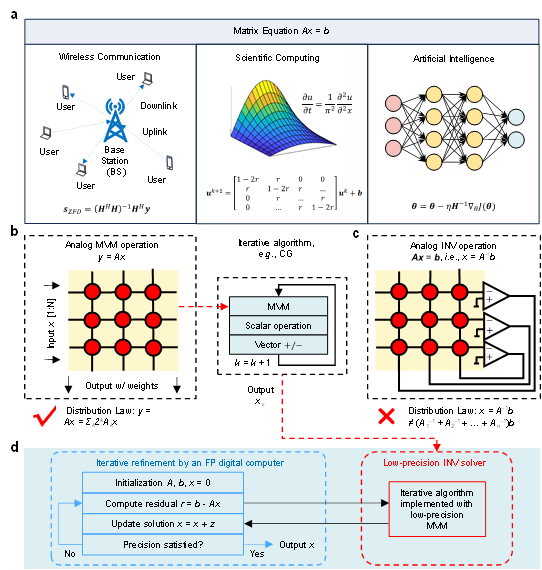 基于阻变存储器阵列的模拟矩阵计算技术,被视为有望解决上述难题的路径之一。特别是基于“阵列-运算放大器”闭环反馈原理设计的矩阵求逆电路,能够实现矩阵求逆的一步式求解。尽管此类电路具备高速、高能效的计算潜力,但其固有的低精度特性仍是关键瓶颈,同时电路的硬连接结构也对其可扩展性构成挑战。此外,在模拟矩阵乘法计算中,可通过比特切片、模拟补偿等策略提升计算精度,也可通过将分块子矩阵映射至多个阵列的方式实现扩展性。然而,矩阵方程求解过程缺乏有效的分配律与分块矩阵方法支撑,这使得模拟矩阵求逆的精度与可扩展性问题长期未能得到有效解决。