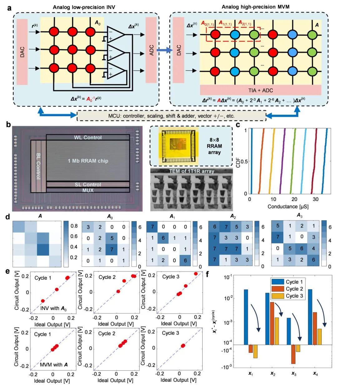 当前,部分基于数模混合迭代的研究方案仍存在明显局限:一方面,此类方案虽可借助浮点数字计算机实现高精度残差计算,却大幅削弱了模拟计算在降低复杂度方面的核心优势,同时还需频繁执行模数转换操作;另一方面,现有模拟矩阵求逆电路的实验验证规模仍局限于小规模场景,且所用器件缺乏可靠的多级存储特性。