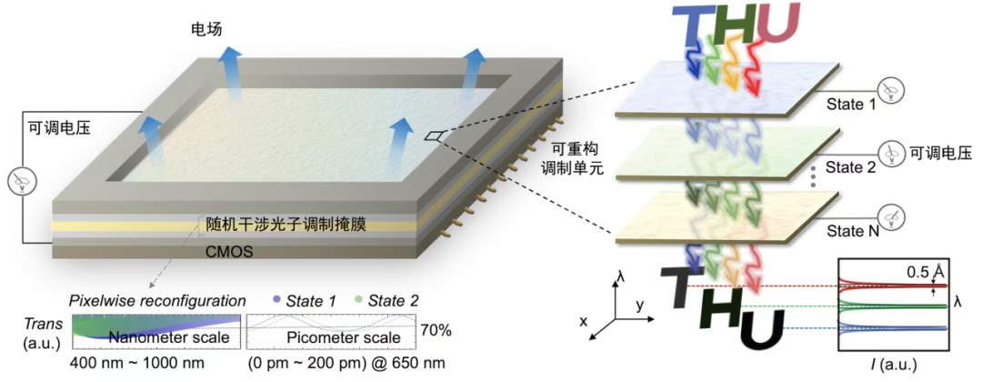 研究团队基于智能光子原理,创新提出可重构计算光学成像架构,将传统物理分光限制转化为光子调制与计算重建过程。通过挖掘随机干涉掩膜与铌酸锂材料的电光重构特性,团队实现高维光谱调制与高通量解调的协同计算。