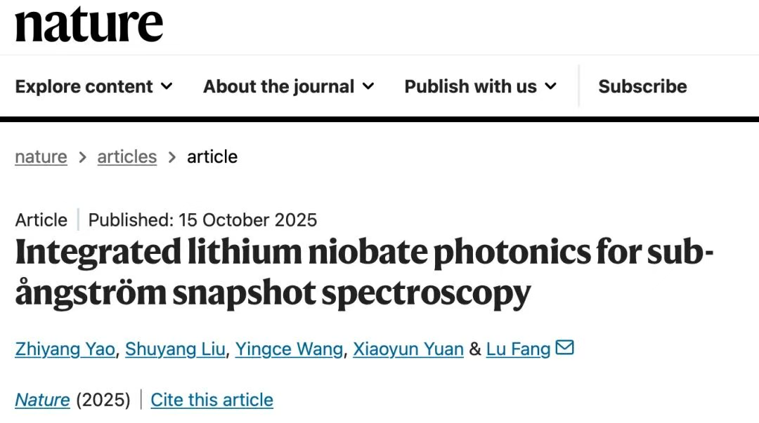 清华大学电子工程系方璐教授团队在智能光子领域取得重大突破,首创了可重构计算光学成像架构,研制了高分辨光谱成像芯片“玉衡”,实现了亚埃米级光谱分辨率,千万像素级空间分辨率的快照光谱成像,标志着我国智能光子技术在高精度成像测量领域迈上新台阶。相关研究成果以《集成铌酸锂光子学亚埃米级快照光谱成像》(“Integrated lithium niobate photonics for sub-angstrom snapshot spectroscopy”)为题在线发表于学术期刊《自然》。