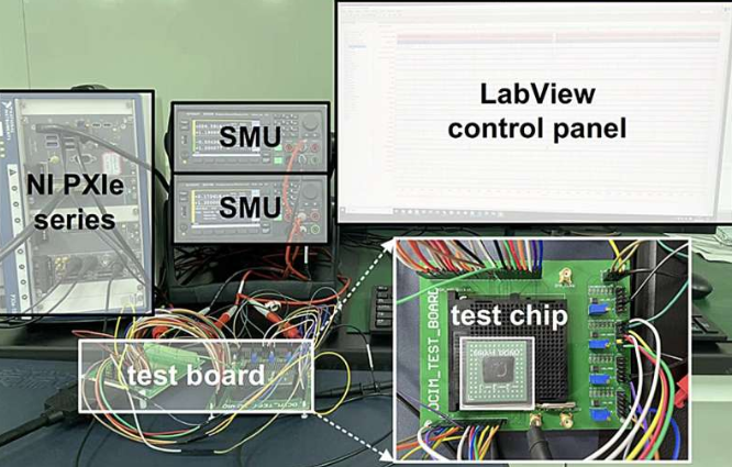 该团队用于评估 nvDCIM 芯片的实验和测量平台。来源:Nature Electro