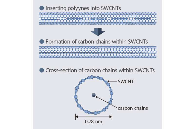 在过去十年间,一种颇具前景的碳纳米线合成方法得以开发,将受限在碳纳米管内部的小型碳基分子进行高温加热。长线性碳链在直径为 0.7-0.8 纳米(nm)的单壁碳纳米管(SWCNTs)内稳定性最佳,但以往的大多数尝试所合成的单壁碳纳米线(SWCNWs),直径均超过 0.9 纳米。