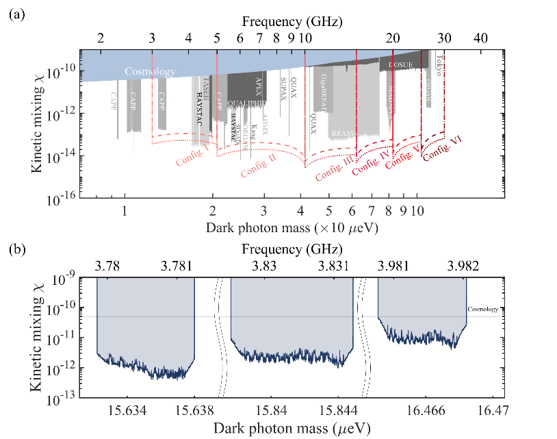 研究团队设计制作了三比特超导量子芯片,可以同时对15.632-15.638、15.838-15.845及16.463-16.468µeV三个能区的暗光子进行搜寻,并给出了相应区间内最严格的暗光子-光子耦合界限,实验结果相较此前基于天文观测的界限提升了1–2个数量级(图b)。这项工作展示了超导量子比特在粒子物理领域的应用前景,为未来实现更宽质量区间、更高精度的暗物质探测提供了基础。