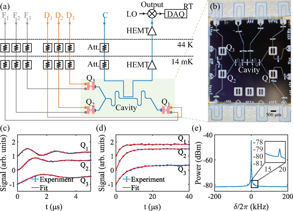 上图为实验装置示意图,该装置包括三条磁通线(F1、F2、F3)、三条驱动线(D1、D2、D3)、一条腔输入线(C)、一条输出线以及一个三量子比特芯片(绿色方框所示)。